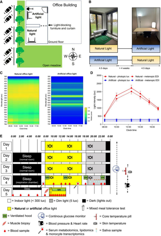 由荷兰马斯特里赫特大学医学中心牵头的研究团队招募了13名2型糖尿病患者,采用随机交叉对照试验,每位参与者都需经历两种为期4.5天的办公环境。在“自然光组”,办公桌被安置在宽大的窗户前,参与者面朝窗外工作,接受动态变化的自然光照。而在“人工光组”,同一房间被完全隔光,仅通过荧光灯和LED灯提供恒定、低强度的300勒克斯 照明,这是典型办公室的光照水平。为了确保实验的纯粹性,研究人员设定了极其严格的控制条件:饮食、活动、睡眠时间完全一致。即使离开办公室,参与者也会佩戴橙色镜片的蓝光阻挡眼镜,防止眼睛接触到日光的短波成分。
